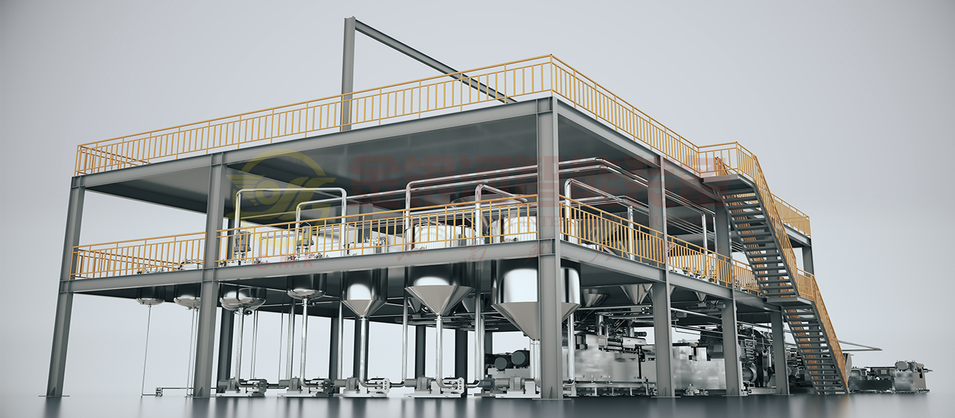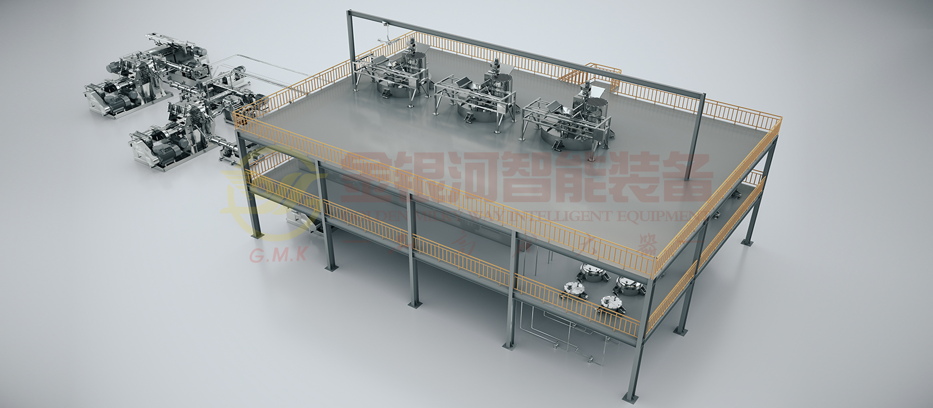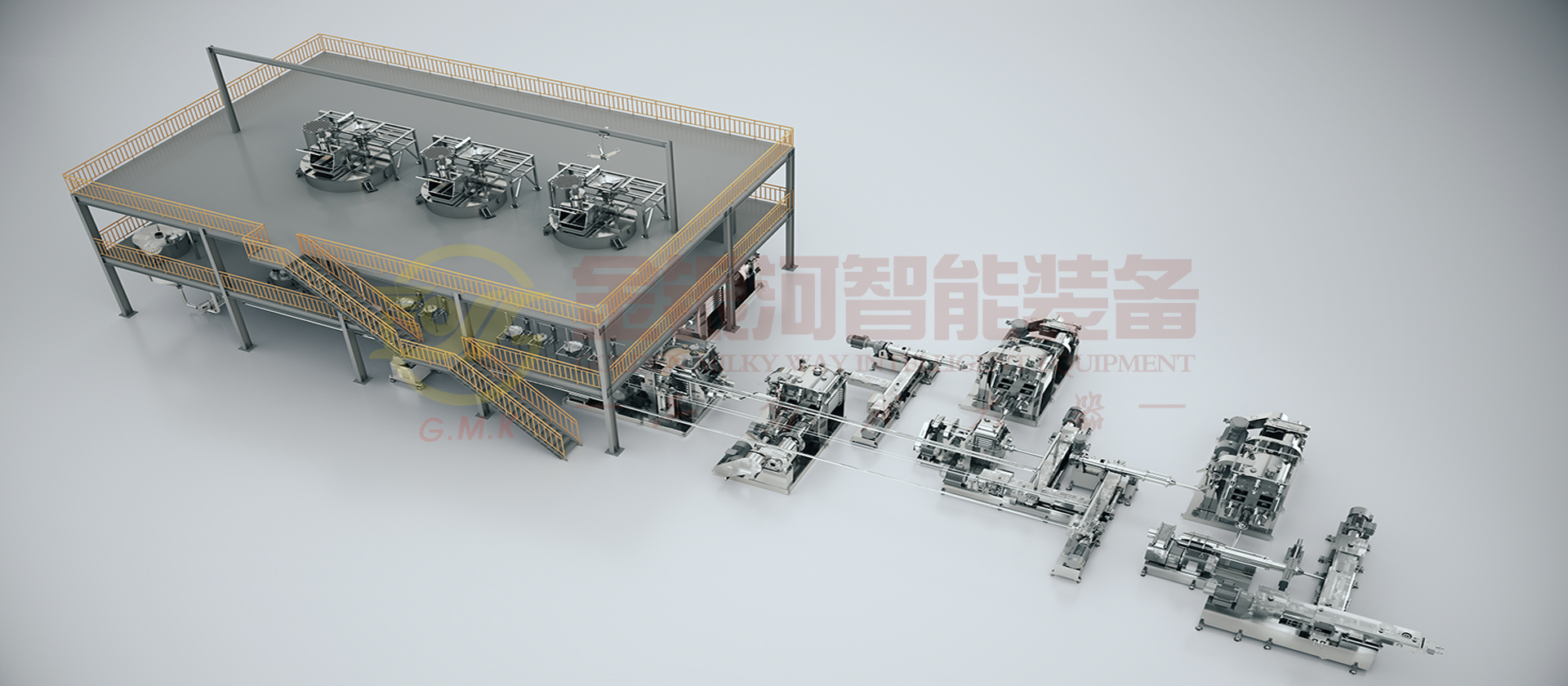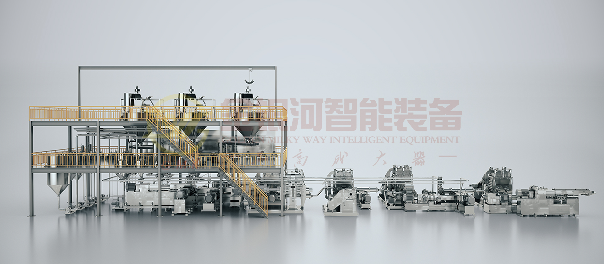 由计量斗、称量及输送系统、贮罐、多工位出料机,增压机、静态混合机、双螺杆螺旋混合机、辅助设备及DCS中央控制系统组成。液体的原材料(粉体与液体)通过精确的计量系统在线自动和连续输送到螺旋混合机中,液体胶的原材料(粉体与液体)通过精确的计量系统在线自动和连续输送到螺旋混合机中,分三段完成粉液混合,对产能大大提高,产出基料后进入多工位机临存反应,再通过双螺杆螺旋混合机完成混合、分散、研磨、抽真空等完成基胶后进入在线静态混合机加入助剂再次混合,经双螺杆螺旋混合机在线冷却后包装。它的生产效率高,适合大规模生产;它具有自动化程度高,杜绝物料直接接触空气,产品质量稳定性好,物料及能源损耗少等优点。